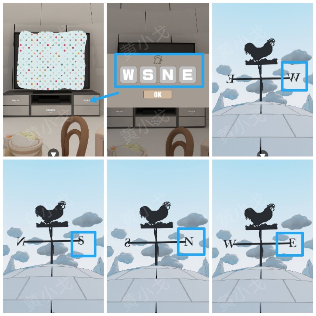 19.点击电视柜右侧抽屉上的密码锁,根据上面的公鸡图案提示,结合[男人]场景公鸡指针指向线索,输入密码:WSNE