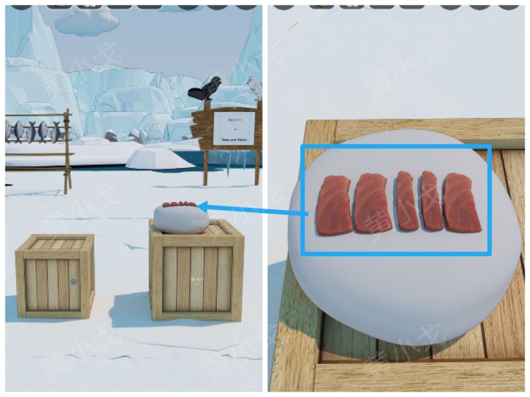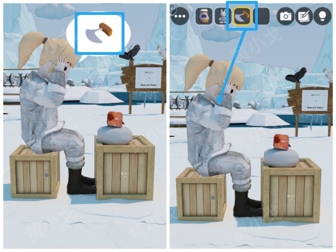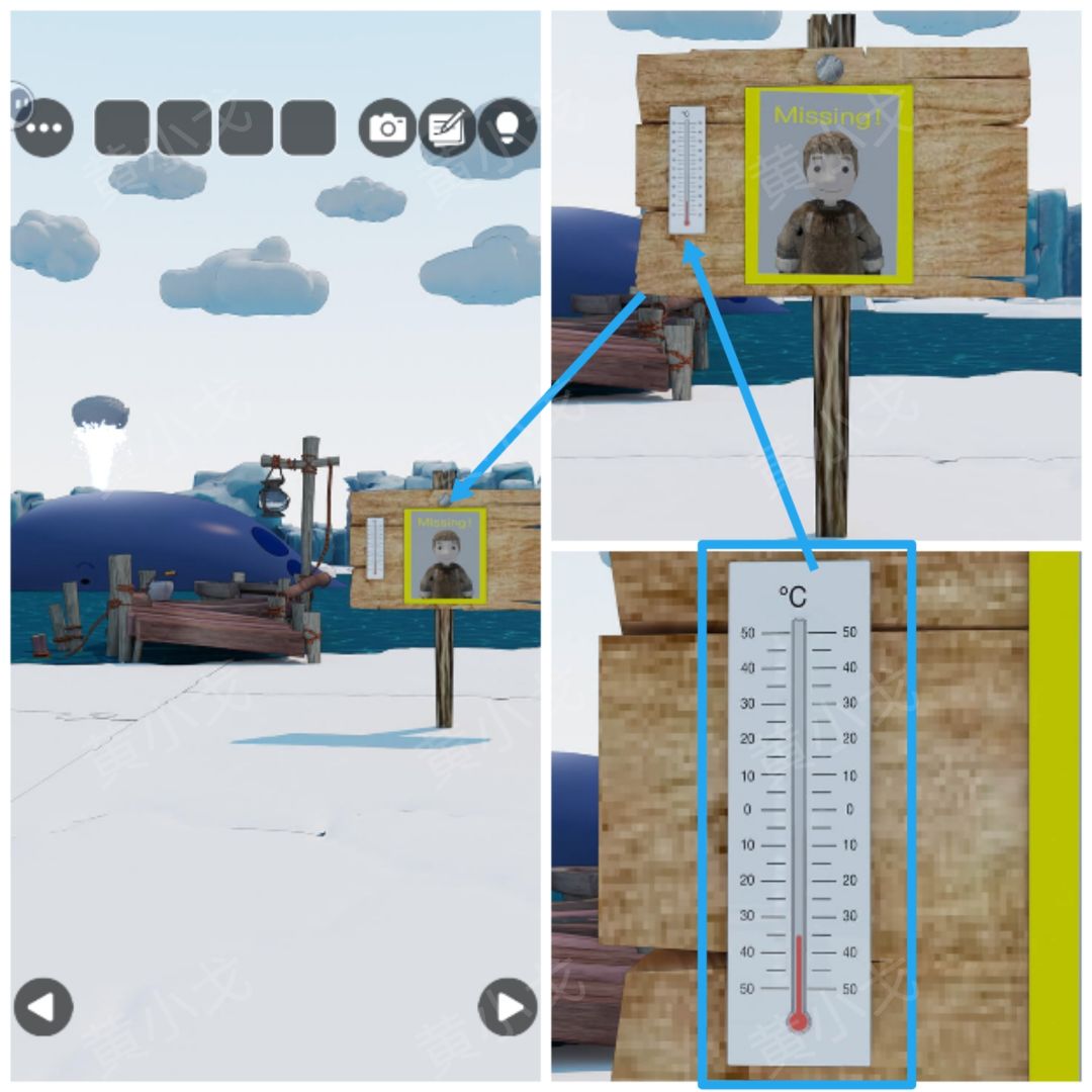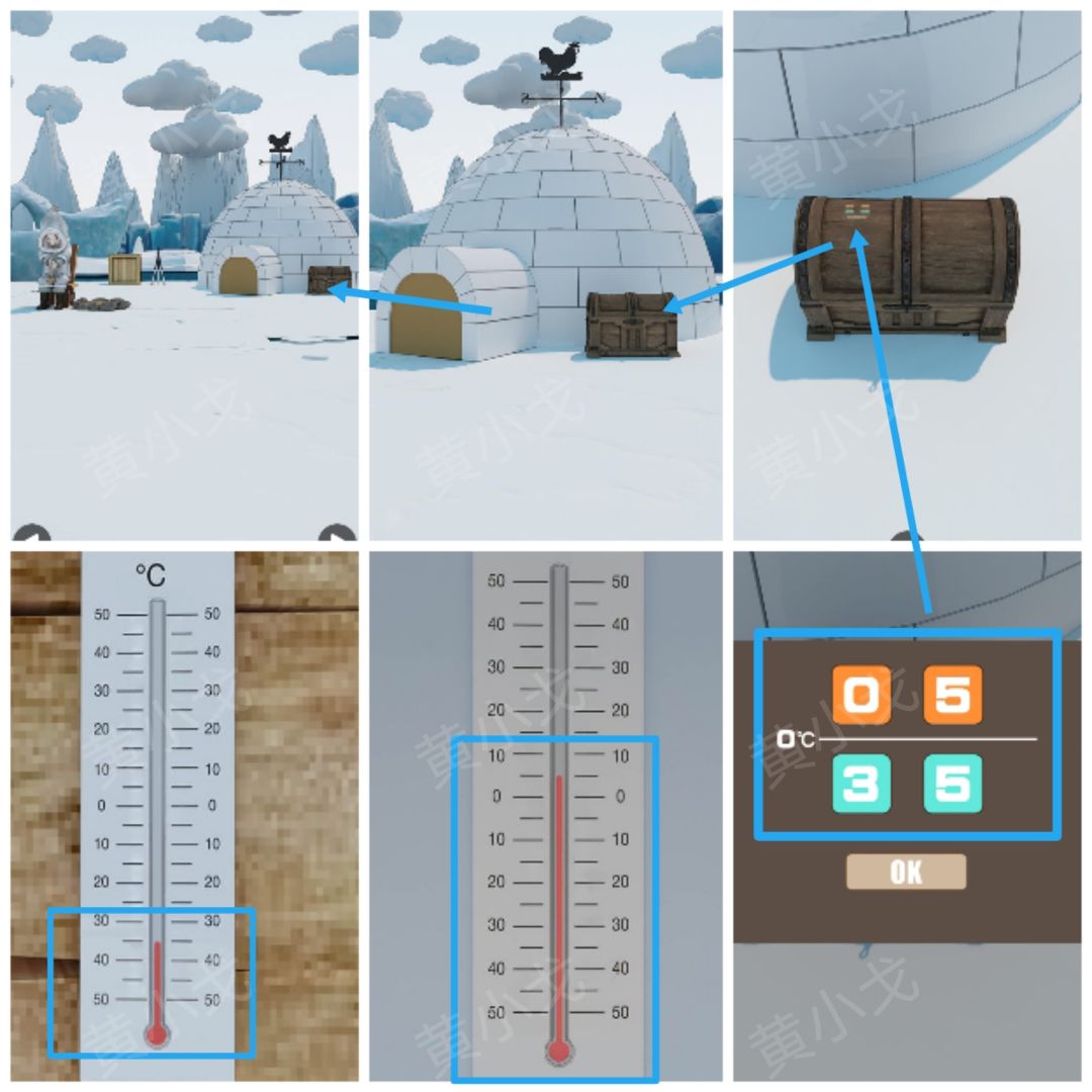 11.点击雪屋外面的箱子上的密码锁,根据上面的提示,结合[鲸鱼]场景告示牌上的温度计线索和[男人-雪屋]场景冰箱里的温度计线索,调整密码锁