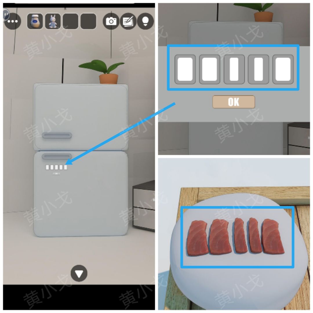 30.点击冰箱冷冻层上的密码锁,根据[女人]场景肉片大小线索,调整密码锁