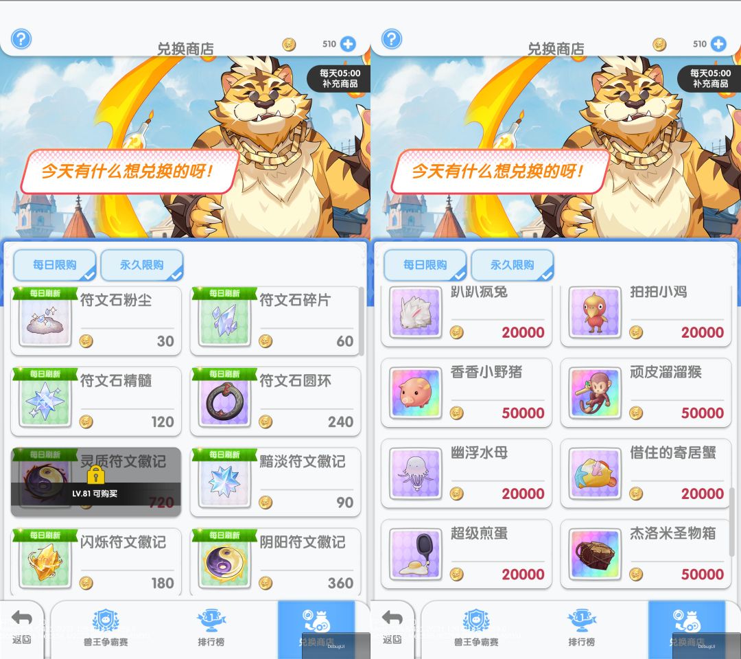 - 通过争霸赛获得的兽王币可以在兑换商店使用。商店每天5点补充商品。可以兑换时装部件和宠物符文升级道具等等~~