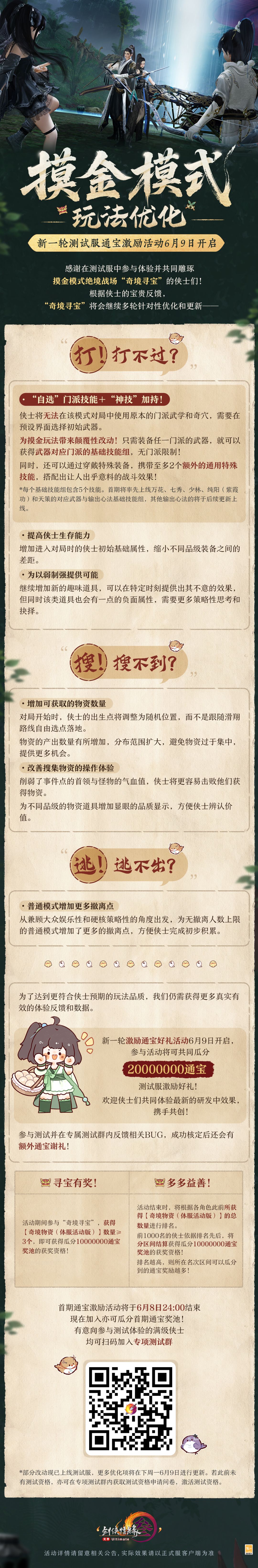 同时,我们也热忱地邀请更多侠士参与测试服体验!新一期“奇境寻宝”测试服通宝激励活动即将开启,参与活动将可共同瓜分20000000通宝!