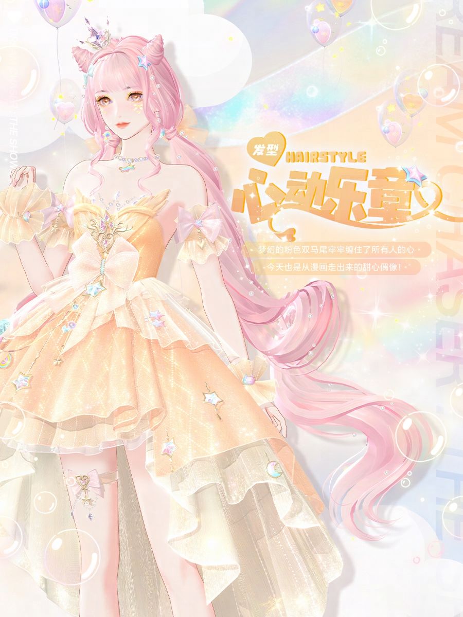 飘逸裙摆装饰着星星与月亮,七彩蝴蝶结和宝石化做极光环绕着裙摆,编织成缀满宝石的梦。元气活力的橙色如同蜜糖,蕾丝袖口与蝴蝶结腿环糖分超标,堆成甜味幻想。