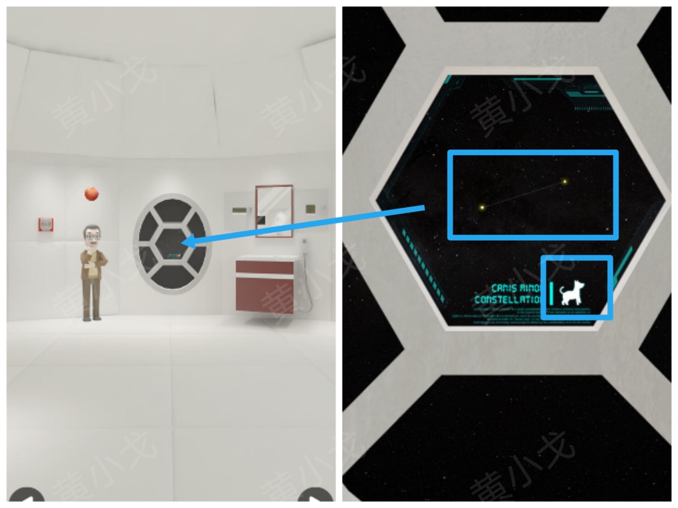 26.点击右侧墙上下层柜子上的密码锁,根据上面的星象图案提示,结合[舱室]场景窗户外的星象图案、[洗水台]场景窗户外的星象图案和[控制室]大屏幕上的星象图案线索,调整密码锁