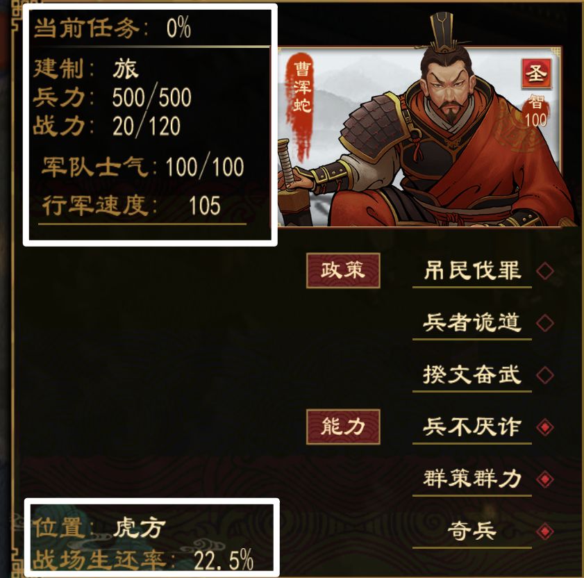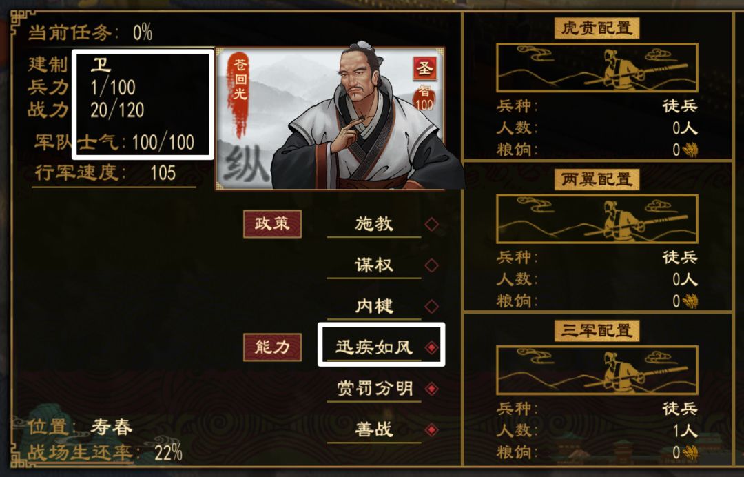 新得到的军队建制必然是卫,兵力100.我们先削减兵力至1,然后让鬼谷子上任。再然后用犒赏令把士气拉满。如图设置才是正确的。