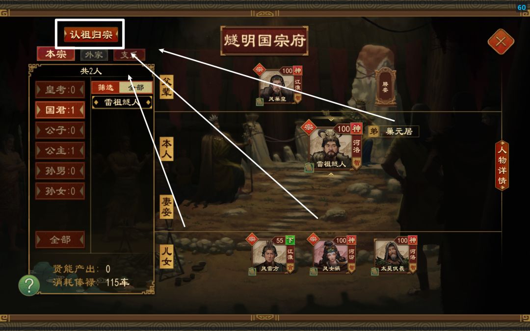 我们开局选择燧明国,即可以使用认祖归宗功能把风伏羲直接相认回国(花费十点正统)
