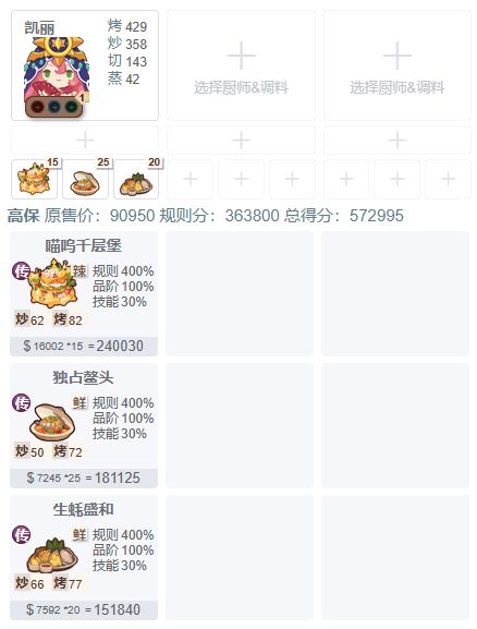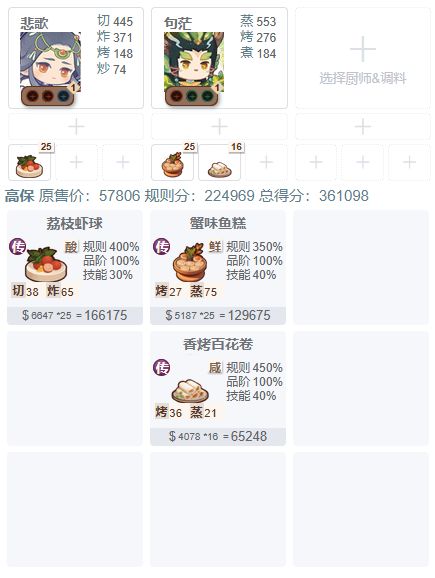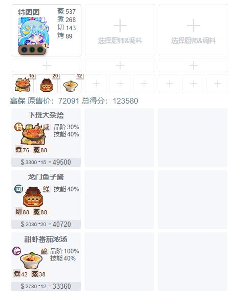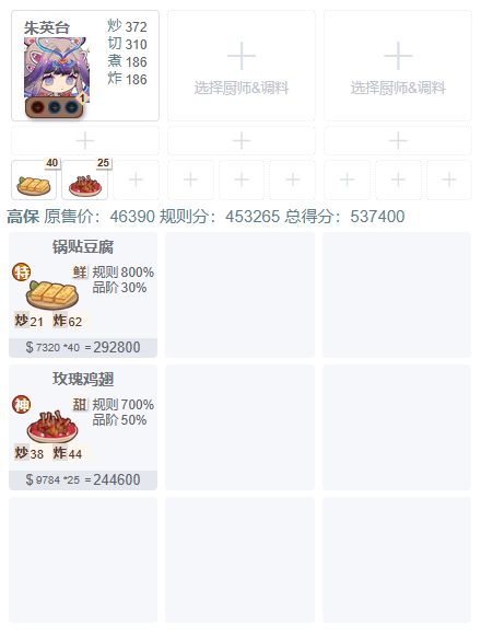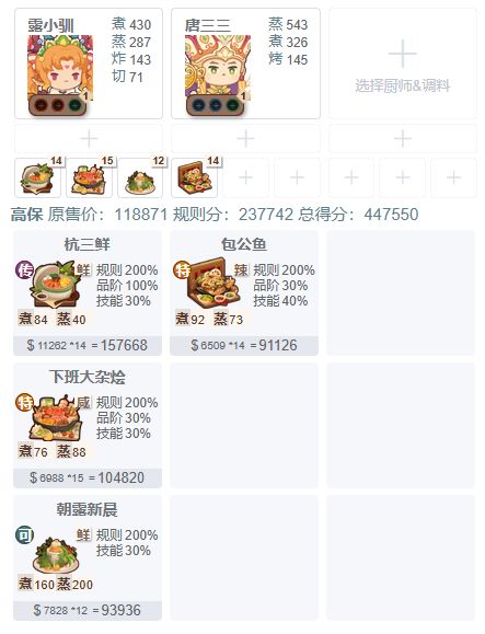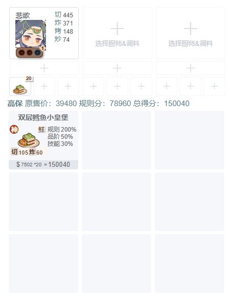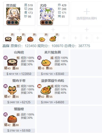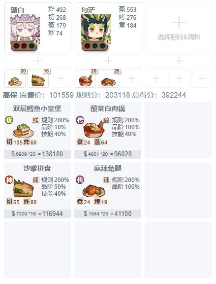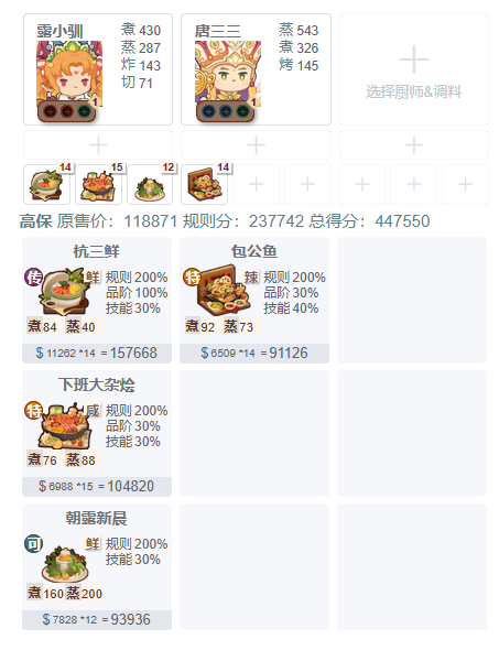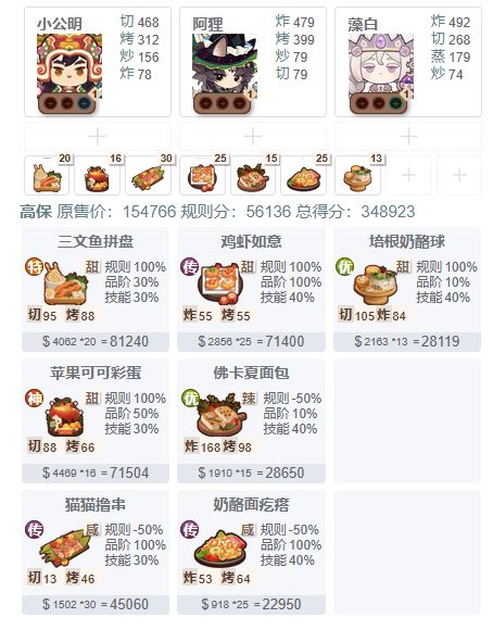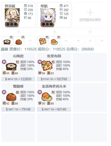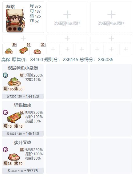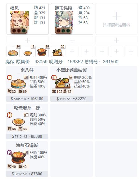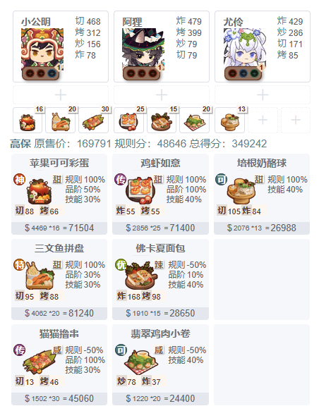 本作业注重点在无氪金厨、无修炼、无加成厨具、无遗玉和调料,在不用后厨菜的前提下用尽可能少的菜达成高保,因此必定会有着一定程度的收集度要求,不一定谁都抄的动,只适用于“万年高保”的懒狗,如果抄不动请自行寻找计算器计算。