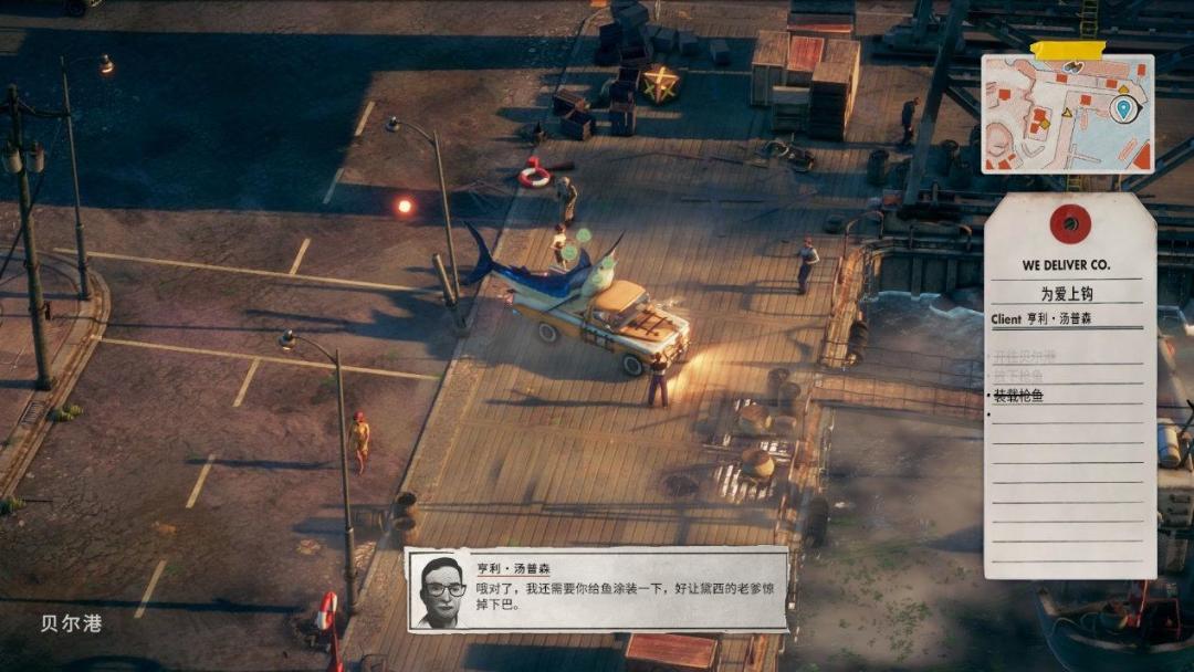 就我个人体验来说,任务的实际难度可真不低,比如说初期运送巨型金枪鱼的任务,这玩意隔个几秒就开始饿了然后来个大力甩尾,直接改变了车辆朝向可还行,碰巧行驶在桥上、岸边之类的地方,搞不好就车毁人亡。我只能说这快递人的专业欠佳,好歹做个固定啊。而类似的驾驶阻碍效果,基本上在每个任务中都有出现,公司皮卡本来操控性就差,结果这么一来更是让人血压升高。我只能说本作的驾驶部分让我玩出了《微软模拟飞行》的感觉,开飞机时受到随机的气流干扰也不过如此(?)。