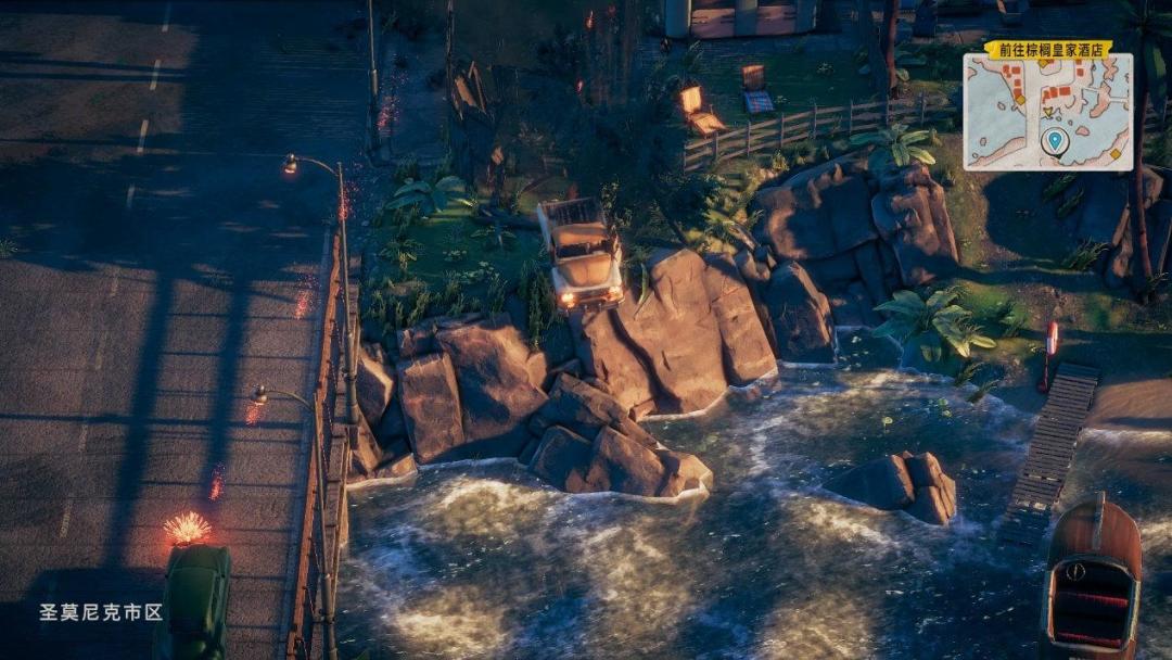 但是车辆的控制做得有点奇怪,油门一加就飞跑,转向特别滑,平常也就罢了反正条条大路通罗马,开歪了就从人家房子撞过去就完事了,只要不碰到水那也无所谓——本作中的主角和GTA早期的主角一样遇水即溶,这设定可太让人怀念了。但任务中就会有点折磨了,撞击会导致任务物品减少或者频繁掉落,很容易导致任务失败从前一个节点重来——因此只能小心翼翼的行进,我都不知道我是在送货还是在拆弹,玩着玩着就容易满头大汗,这还是挺影响体验的。