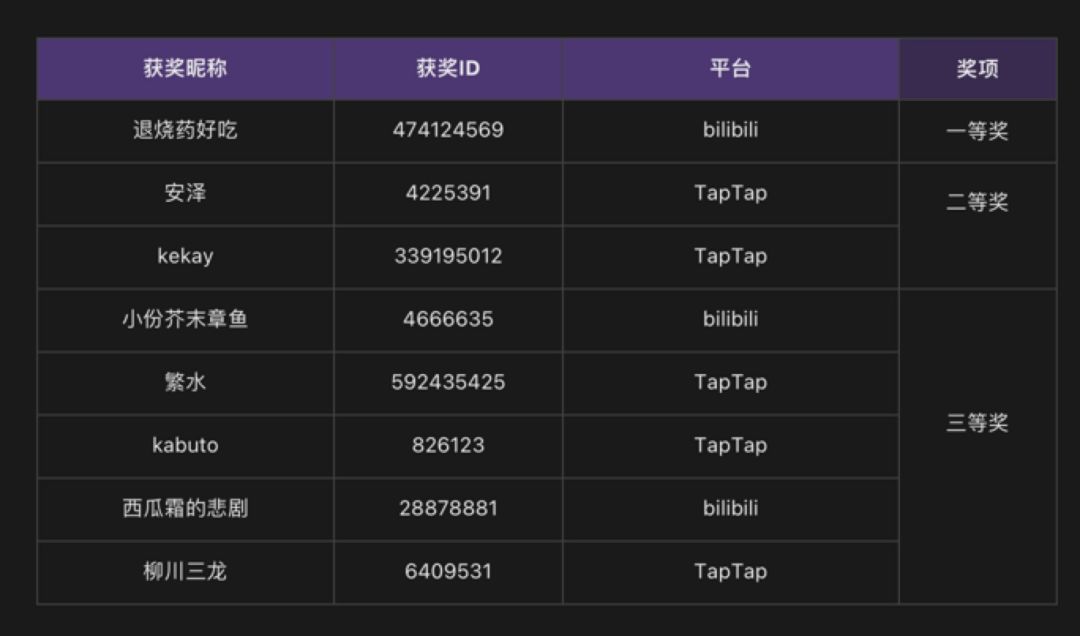 衷心感谢所有参与本次1.1版本[梦醒攻略]征集活动的玩家!在活动期间,我们收到了数百份的精密攻略,经过严格审议,依据攻略社区热度、攻略内容深度、策略创新性等多角度,我们从bilibili和TapTap多平台选出此次征集活动的获奖者。特将名单公示如下: