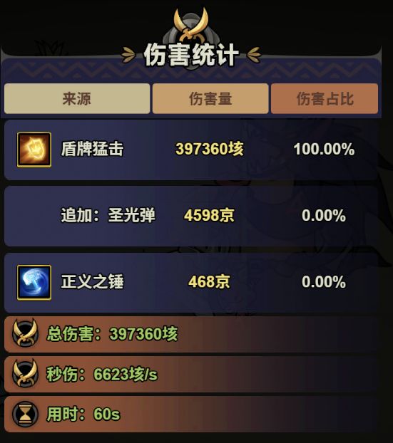 目前我只有白色4圣化的武器,第3条是怒意,每秒+0.5%伤害加成,一般见到BOSS大概是90秒,所以打桩测试时也先等了90秒,60S测下来是秒伤6623垓。