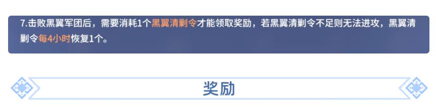 黑翼军团需逐级挑战,挑战时需消耗黑翼清剿令(首次挑战该难度不消耗次数)。每4小时恢复一次黑翼清剿令,也可通过商店和礼包等渠道购买额外的清剿令。