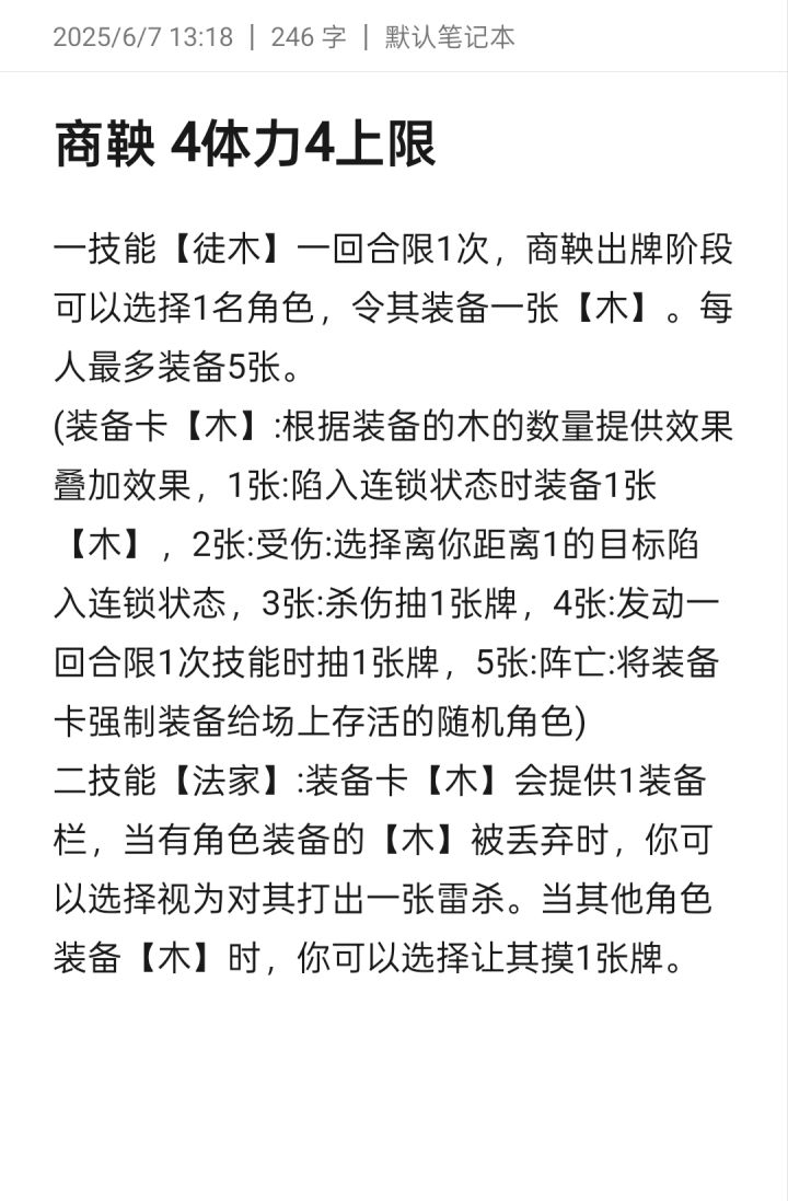 一技能【徒木】一回合限1次,商鞅出牌阶段可以选择1名角色,令其装备一张【木】。每人最多装备5张。