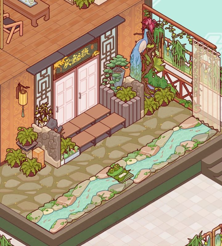 图二是一层入户,利用墙面装饰和满月套间里的匾画打造了中式大门,外面是小河潺潺,透明的白纱隔断当做水瀑