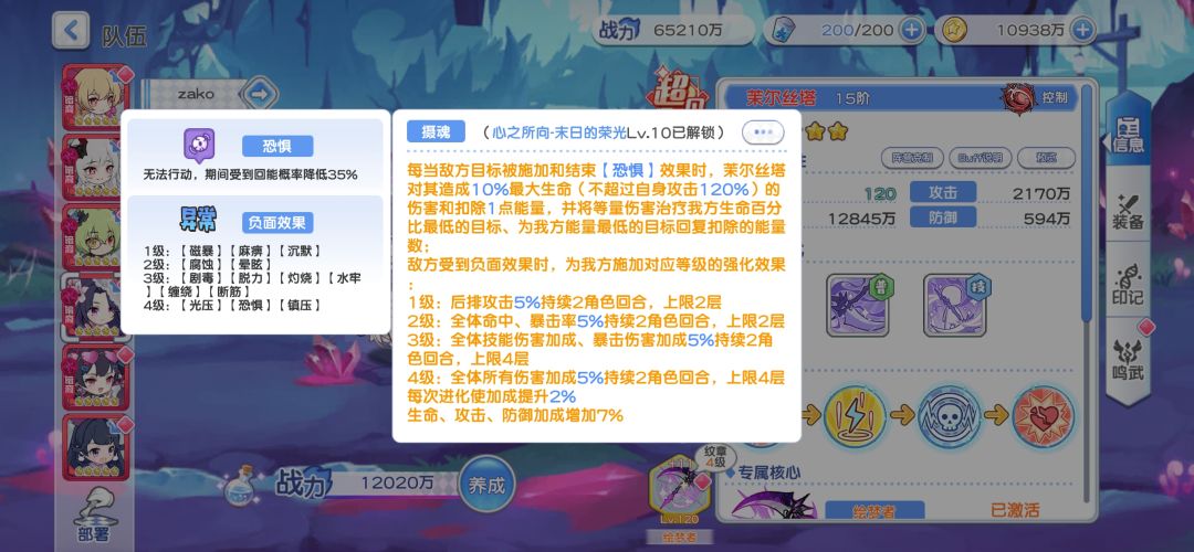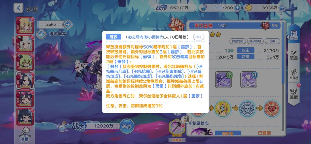 这里对对方50%概率施加一层噩梦应该是可以被控制红武所增加概率的(由于uu是零氪没有控制红武所以不太确定)首次释放技能是百分百对敌方三个目标施加3层噩梦,如果没有触发恐惧就会对敌方攻击最高的目标额外施加2层噩梦,从而触发恐惧,这里可以看到,茉尔对敌方攻击最高的目标限制很大,也是变相给自己加容错了