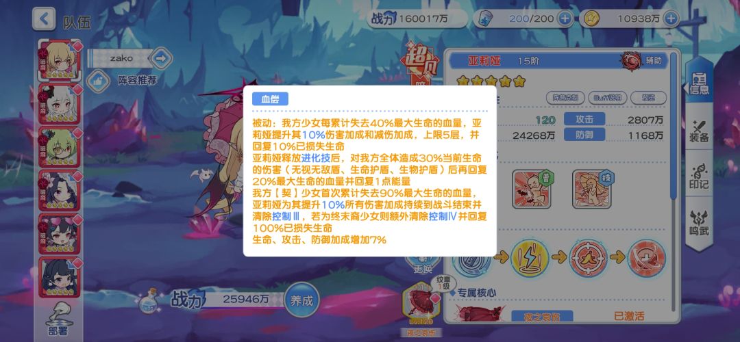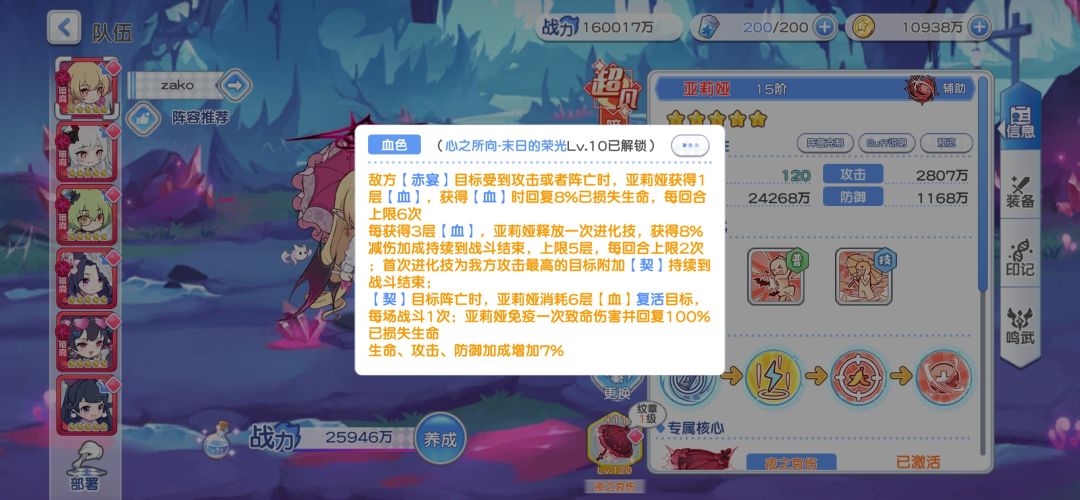 可以看到亚莉娅的机制,敌方赤宴目标受到攻击或者阵亡的时候可以自身获得1层血,每获得3层血可以释放一次进化技,释放后获得8%减伤持续到战斗结束,进化技每回合是上限两次的,这也是因为一回合只能获得6层血的关系,重点来了,首次释放进化技是可以给攻击最高的友方角色施加契,被施加契的目标阵亡时是可以消耗6层血复活一次的,可以说容错率非常高,然后亚莉娅本身也是有一次复活的,免疫一次致命伤害并恢复100%生命,这跟复活其实差不多😲