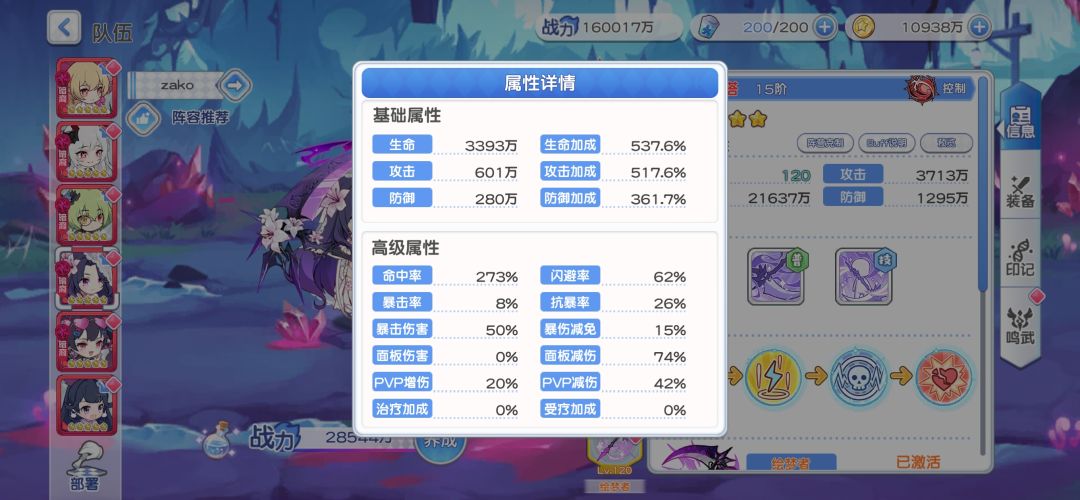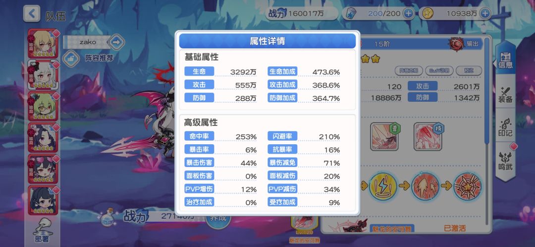 可以看到我携带的印记以及面板属性,不难看出来,我的遗物搭配选择的是闪避+命中,鸣武是带的斗篷,选择了牺牲龙娘在暗队的绝对地位(攻击最高)选择让她去当一个工具人给敌方挂毒,并且依靠闪避这个属性增强生存能力😋