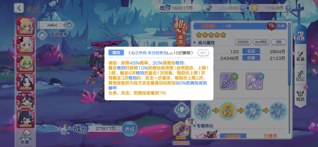 下面是艾尔莎,也是我们暗队第二主力,你游目前最强的盾角色 攻守兼备,可以看到,艾尔莎的技能介绍里面也有一条,释放技能后会为我放攻击最高目标施加80%防御加成的幽甲,想必大家现在也知道了,暗队的增益以及buff基本都是给予攻击最高的角色,那么攻击最高的角色在暗队就会起到决定性的作用,正常情况来说,暗队里面攻击最高的角色大部分人肯定都是龙娘,因为龙娘毕竟是主c,并且你游由于PVP奖励一坨,导致其实PVP的遗物以及印记是没有太多改动的,基本跟PVE一样,但由于弓妹的出现我觉得其实还加强了龙娘在PVP的多样性,因为之前大家用的零龙组合基本都不会选择把东西换来换去,直接将就用就完事了,那现在PVE已经把龙娘淘汰了,那我们可以重新定义龙娘在暗队的地位了,那就是挂毒工具人😎