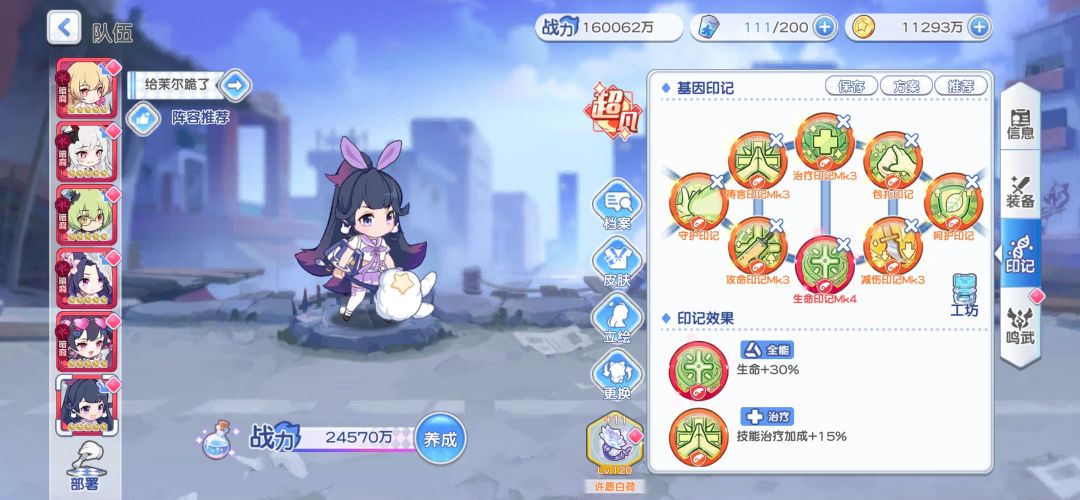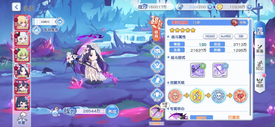 可以看到我的茉尔攻击非常的高,命中也不是很低,这也就对应了茉尔是能吃到上面所说的buff,大大增强的茉尔的生存能力以及伤害,让茉尔来代替龙娘去成为主c,可能有人会有疑问,茉尔一个控制角色哪来的伤害?下面我们来看看茉尔的技能