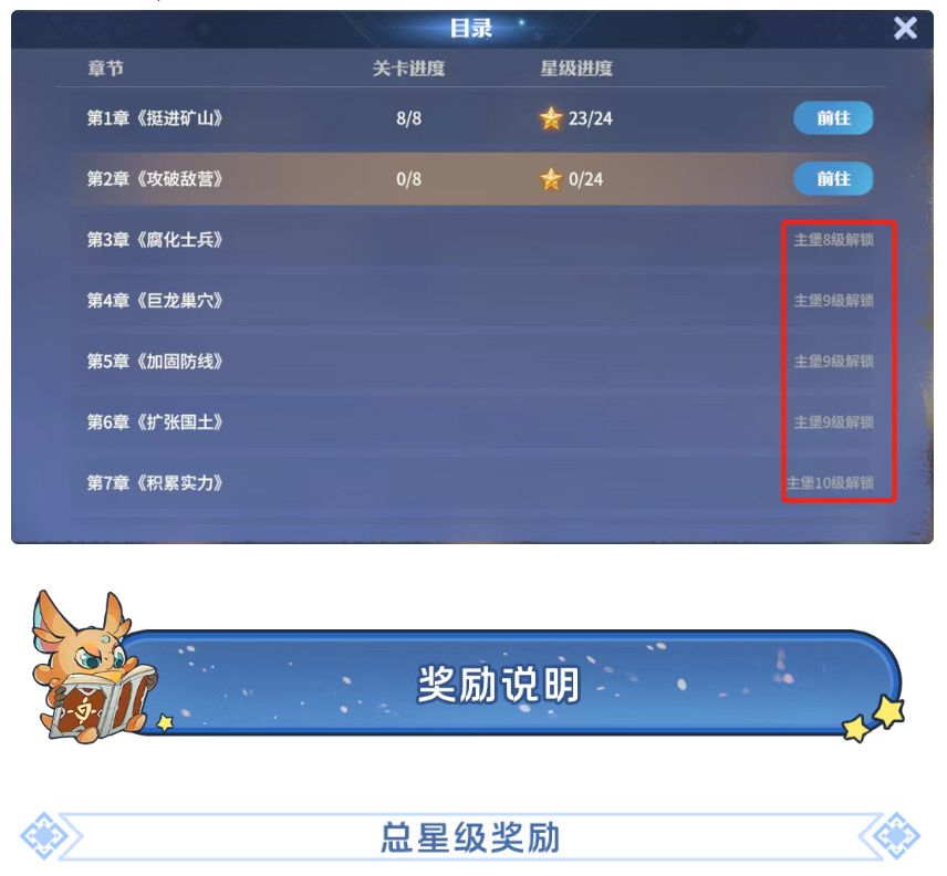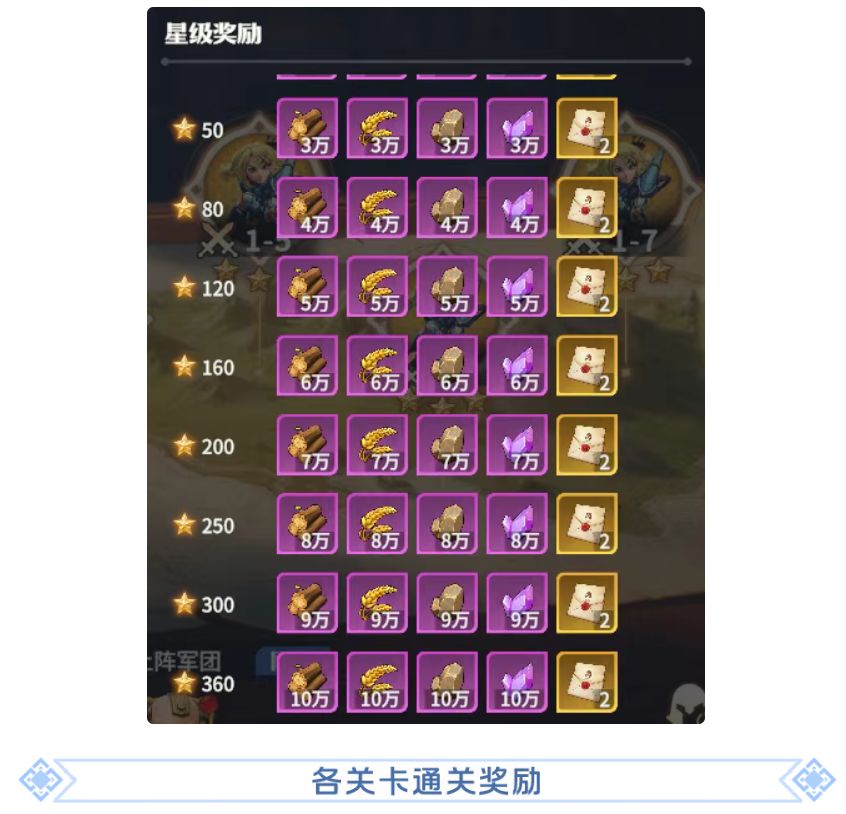 总星级奖励包含大量资源奖励和招募令奖励,建议大家尽量3星完成拿满奖励。前期策略建议:英雄、科技、兵种发育不全时,可先以低星通关积累星级与资源,补强队伍后再回头完成 3 星完美通关,随后挑战高难度关卡,形成良性循环。