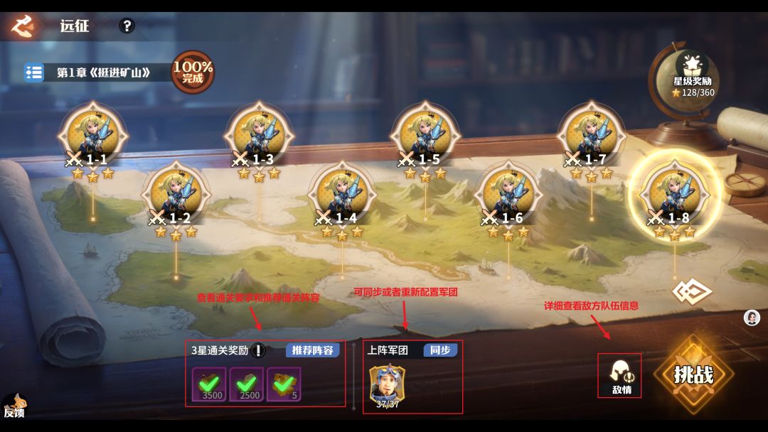 章节解锁建议:远征共分为15章节,会根据主堡对应等级进行解锁,所以,尽早提高主堡等级,解锁更高章节,有助于更快的获取资源。