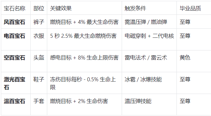✨低成本搭配案例燃烧流平替:黄色风百(裤子)+ 燃油弹(免费技能)+ 暴击宝石(头盔)▶️ 效果:对燃烧目标造成 1%+ 暴击伤害,适合前中期清杂感电爆发流:黄色空百(头盔)+ 雷电法术(签到送)+ 穿透宝石(鞋子)▶️ 成本:0 氪金,靠感电触发 8% 伤害,专门打火系 BOSS