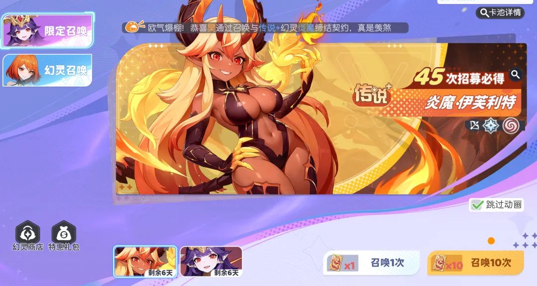 接着在UP池方面,普池有票立刻就抽即可,钻石更多用来买限定池的票,前期如果以常规的元素队为主的话建议先抽伊芙利特,然后元素队最好可以抽到两只升到黄色6星,这样才能激活元素的施加效果。当然后续还会开如神话池等UP池,大家注意可以留存点资源以备不时之需。