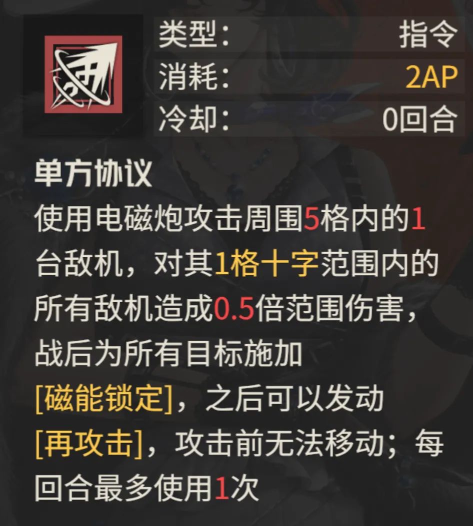 然后刚刚已经提到了,维娜除了可以通过受击来给敌人施加“磁能锁定”状态,她的部分技能也有直接给对方施加“磁能锁定”的效果,例如第1回合就能采用这种方式来一波小爆发。而且维娜很多主动攻击的技能都还包含“再攻击”的效果,这也让她每回合的连续爆发有了一定的保障。