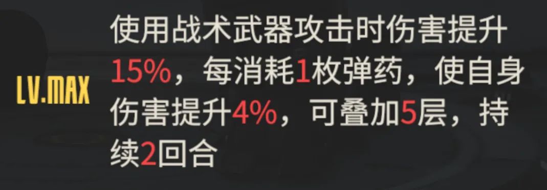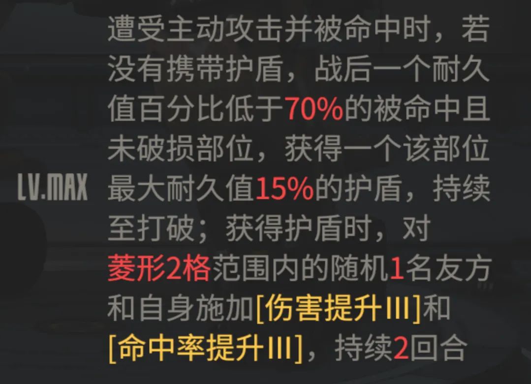 然后第二个模组升满的效果如上图所示,具备一个条件施加护盾的效果,且还有给友方施加增伤与命中提升的效果,功能性还算不错。所以综合而言,维娜的数值其实设定的并不算太高,但架不住她有很强的机制优势,例如这个聚怪后的电磁炮扫头攻击,单次输出的确不算高,但多轮一起啦呢?这......一般的敌人还真是有点扛不住,接着维娜在援护上又有战术导弹、格斗、突击和射击等武器的一并援护,又一个机制拉满的特性,且无视距离的援护在部分特殊战斗中也有奇效,所以今天在初测了维娜后,维一的第一印象是有点惊讶的,后续等再多一些实测后咱们再上实测报告与抽取分析吧。今天的攻略文章就到这里,如果大家还有任何问题的话都可以添加维一的私人微信heerweiyi1015进行问询,感谢大家的支持!