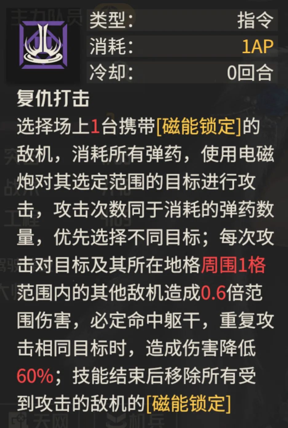 首先维娜的天赋就有点小作文的意思了,而如果要简化这个天赋的效果,说白了就是维娜在挨打或使用特殊的技能后,可以给对方施加“磁能锁定”这个状态,那么针对此状态下的敌人,维娜在主动回合便可以使用【复仇打击】技能进行电磁炮的点头输出。