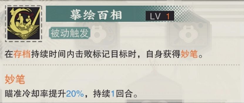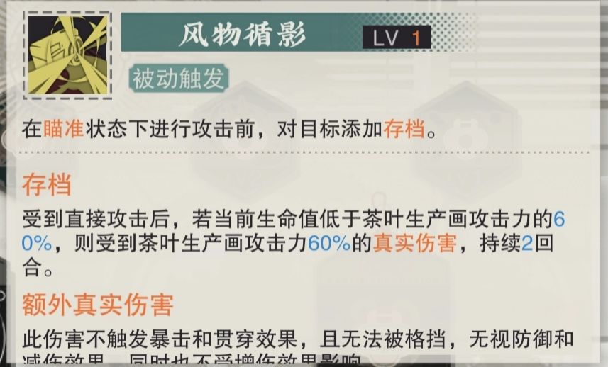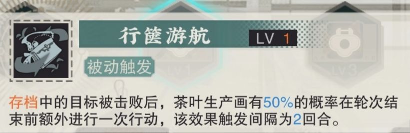这个被动是茶画生产商的核心天赋,也是我推荐的理由。为什么呢?因为这个被动实际上可以多次触发,就比如场上有2个被你挂了存档的怪,都被你或者队友触发斩杀,那么你将会触发两次被动3,也就是你一回合能做到3动,在某些情况下你甚至能做到一回合4动,单次输出不够就靠回合数来凑。