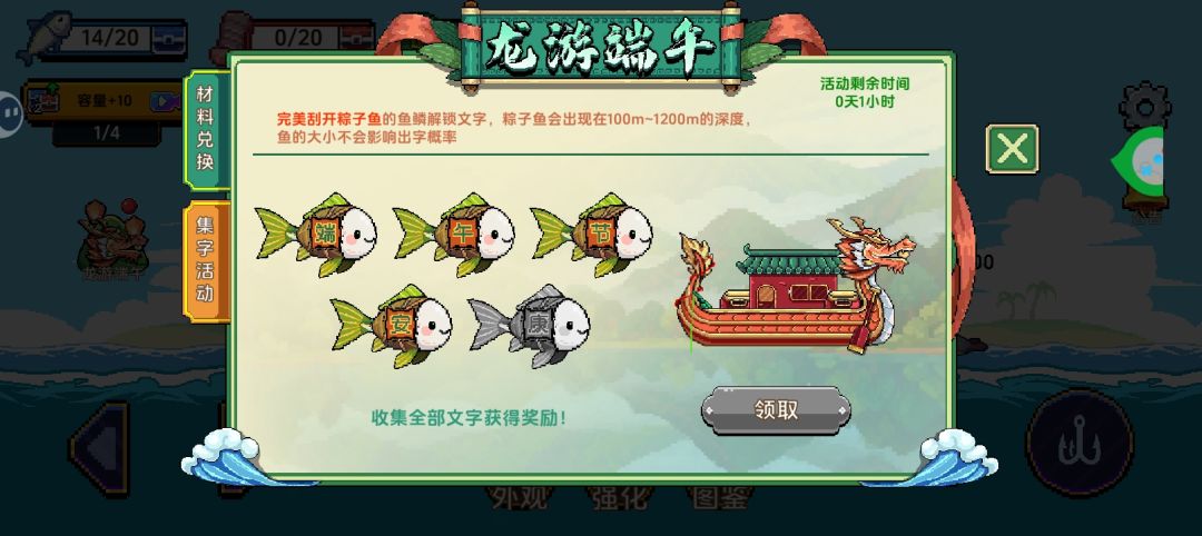 再说这个活动,我已经钓了快20多条端午鱼了,“康”就是解锁不出来,本来端午鱼就很难钓,像我这种看了很多广告但领域只能还在300m左右的,可能下沟一两次才能来一只端午鱼