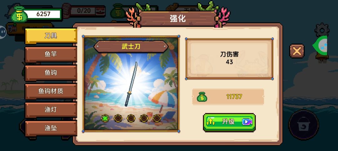因为升级除了鱼钩材质 都是五个五个才能变皮肤,而且五个之间每个价钱都是一样的,就导比如:第一个1000,第二个就是1500这样,要想换一个皮肤样子可能需要花6-7000的样子
