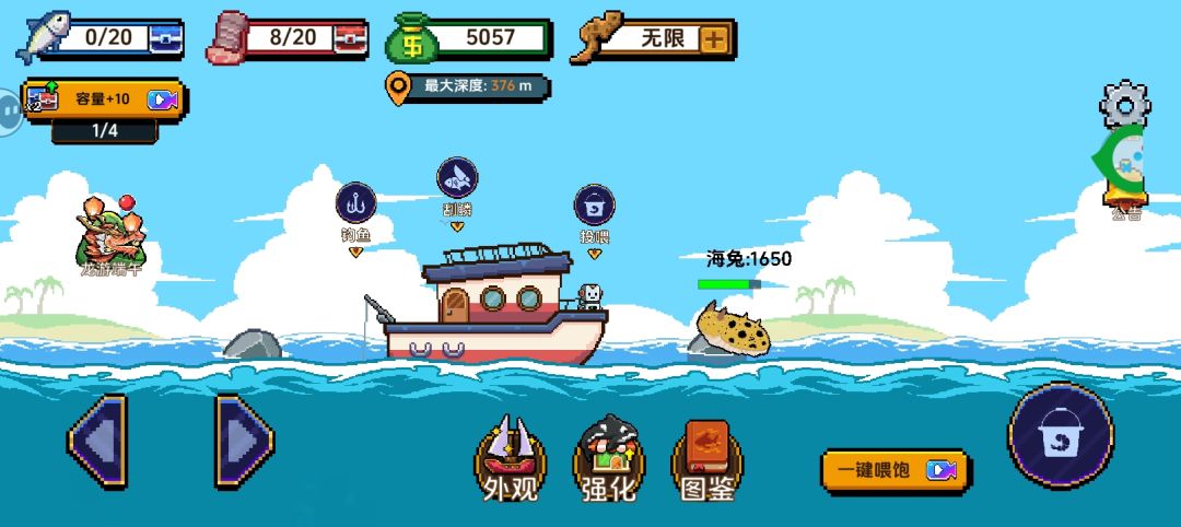 虽然可以调海货赚钱,有100.200.400的海货,但是这游戏主要玩法不是挂鱼鳞喂客人吗?都去钓海货了还有人钓鱼吗?
