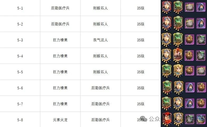 第五章推荐等级为35级,按照前排肉盾英雄,后排输出英雄;前排带上丧气泥人或刚毅石人,后排巨力橡果或者后勤医疗兵;本章节部分关卡如5-1、5-8使用元素火龙可以实现兵种克制(有布巴和罗宾、石诺和托尔可以优先使用)