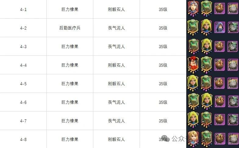 第四章推荐等级为35级,按照前排肉盾英雄,后排输出英雄;前排带上丧气泥人(第四章敌军有钻探机,使用丧气泥人可以实现克制)或刚毅石人,后排巨力橡果或者后勤医疗兵;(有石诺和托尔可以优先使用)