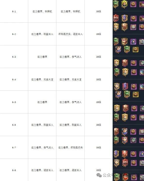 第六章需要两只队伍参与战斗,推荐等级为35级,按照前排肉盾英雄,后排输出英雄;前排带上丧气泥人或刚毅石人,后排巨力橡果或者后勤医疗兵;缺少对空英雄可以补充轰天大兵;若有飞行部队可以使用钻探工等兵种进行搭配(有布巴和罗宾等飞行英雄、石诺和托尔可以优先使用)