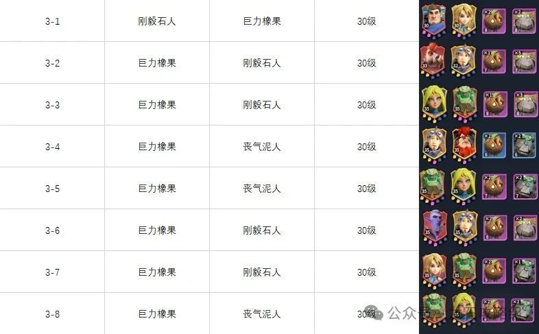 第三章推荐等级为30级,按照前排肉盾英雄,后排输出英雄;前排带上丧气泥人或刚毅石人,后排巨力橡果;第二种兵种方案可以使用钻探工,剩余费用使用巨力橡果补充。(有石诺和托尔可以优先使用)