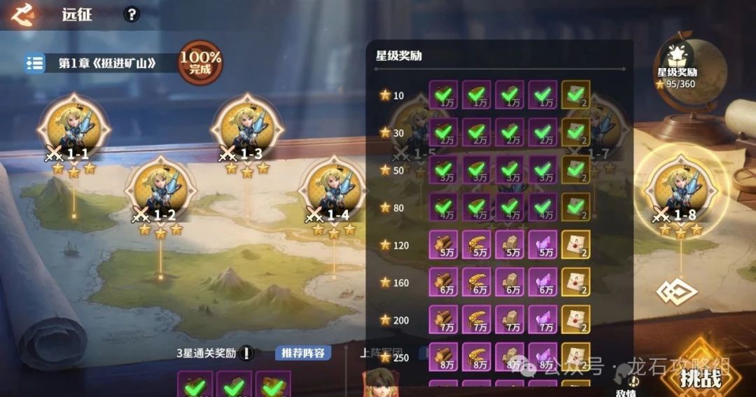 3、星级奖励也是远征中一个快速获得大量资源的一个方式。每个关卡都有星级评分,最高3星,通关达成不同星级数,能领取不同对应奖励(每档只能获取-次),每个关卡达成三个星通过的要求都有所不同,累计星级总数达到一定的数量即可解锁星级奖励。
