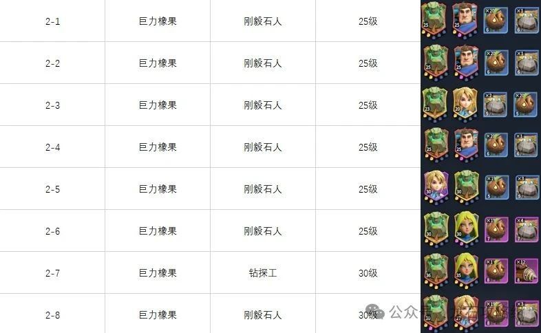 第二章推荐等级为25级,按照前排肉盾英雄,后排输出英雄;前排带上刚毅石人,后排巨力橡果。第二种方案可以使用钻探工配巨力橡果。(有石诺和托尔可以优先使用)