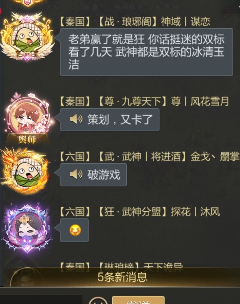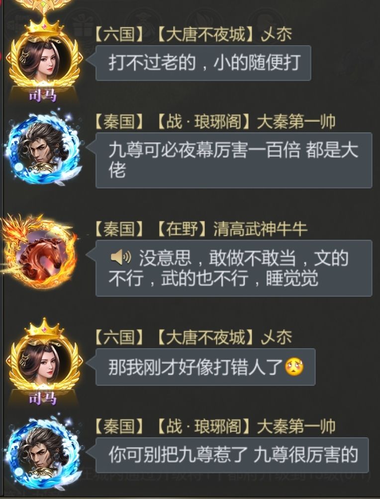 2、琅琊上世界喷人实在不妥,口嗨力量确实强大,,但是管理不制止,,有默认嫌疑,让琅琊有个仇恨的目标才有动力,(之前的目标是凤鸣)毕竟大秦已到末日,再#今天游戏圈发生了啥 种田着估计离解散不远