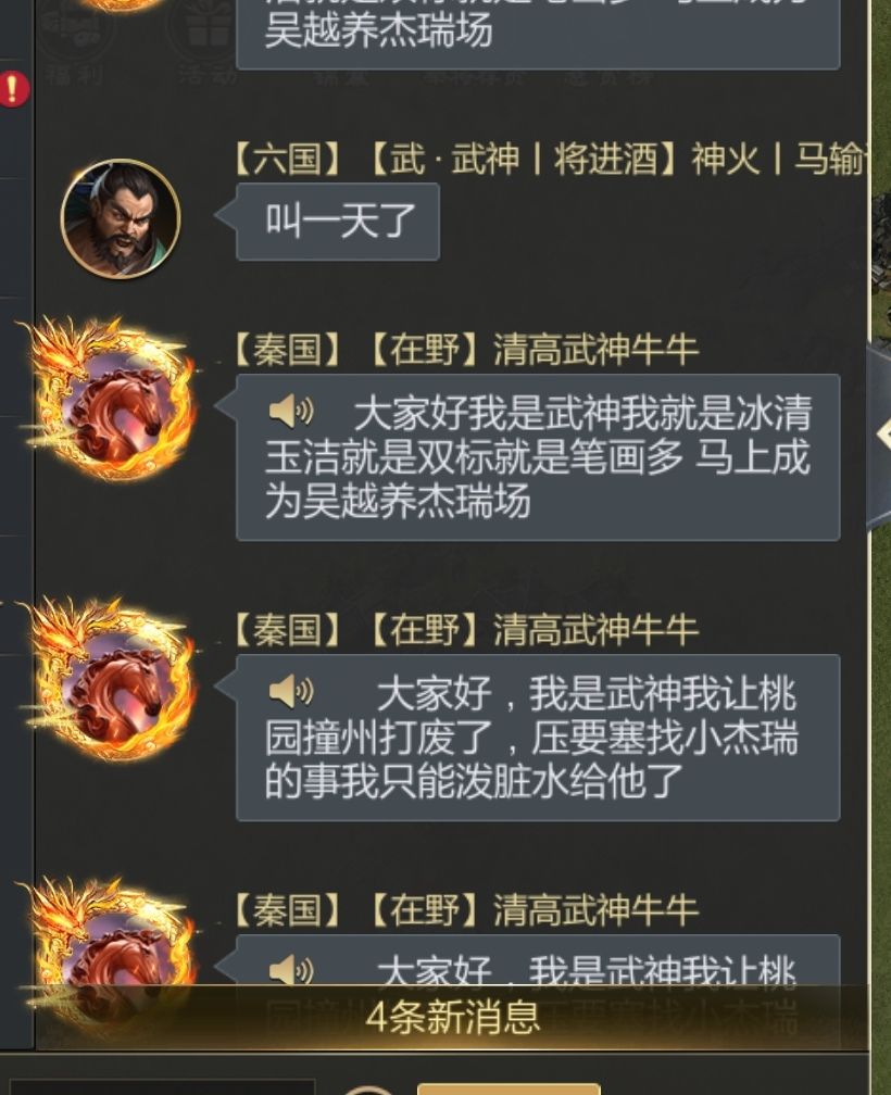 背景:六国开关,不明部队鬼吹灯爆秦国的分成要塞,小号魏无忌说是桃源帮武神压琅琊要塞,,秦国阵营两天激战已经突破三路,武神建立第二防线,余丘,漆邑,观泽,此时还在激情互冲中,,就在此时琅琊人员认为就是武神做的压要塞开始世界吵,有小号牛牛刷屏,,武神部分人员觉得太吵了,也开始反驳,