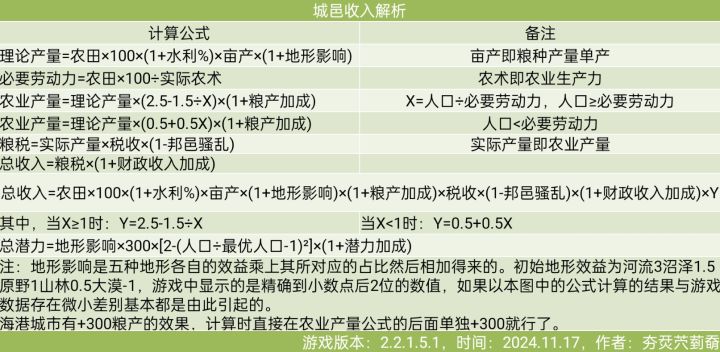 最近开了个档选的农家,用开山劈岭却不知道城邑人口到达上限后如何获得最大潜力以确保后期拥有足够农田,根据@鴥彼飞隼 大佬发的公式(如图)计算出了城邑人口到达上限后最多潜力的地形:60%河流,10%原野,30%山林