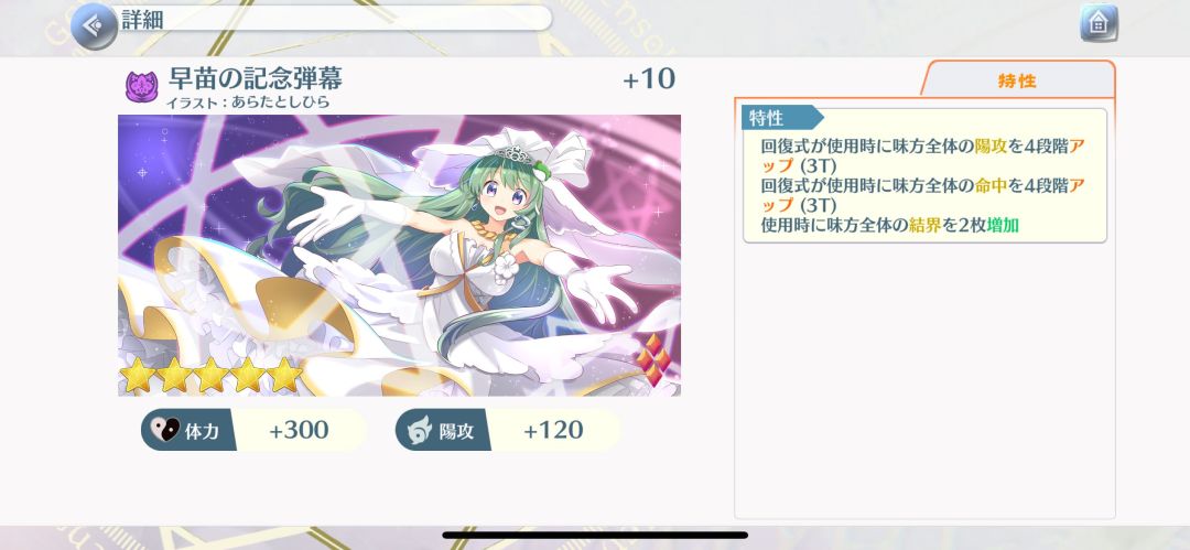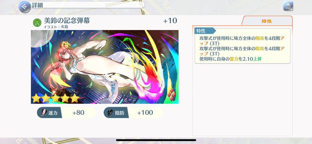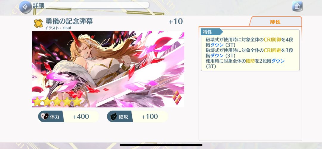 勇仪的纪念弹幕,皮斯的绘卷的相反,破坏式降全体会心攻击4段和会心命中3段,降全体阴攻2段,