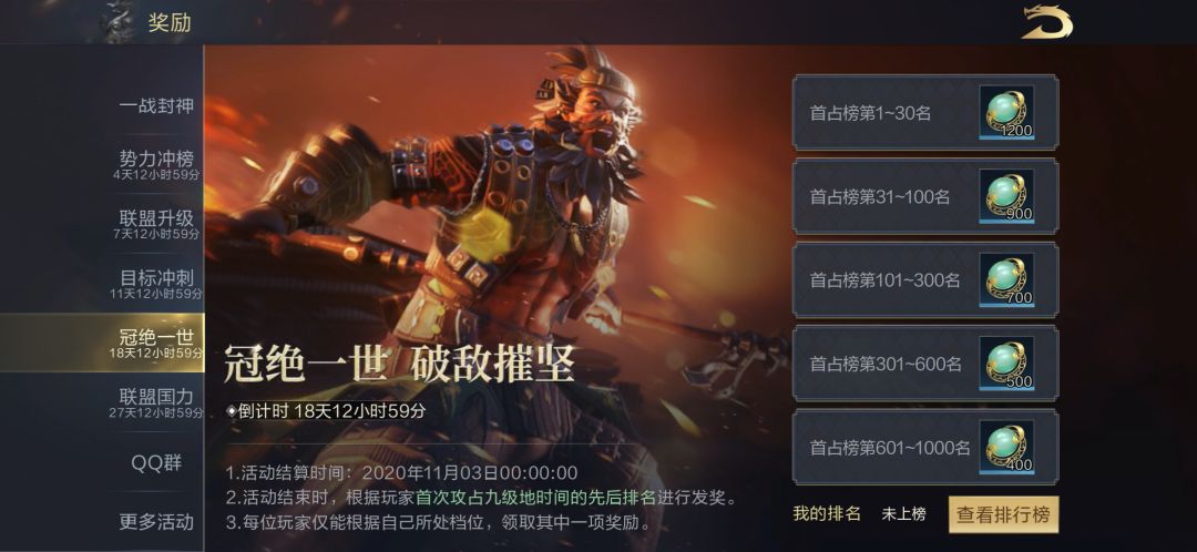 活动时间截止时,会根据全服个人势力值进行排名。根据排行情况进行奖励结算(所有获奖主公的势力值必须≥1000),时间有限,请主公们在活动截止前努力冲榜,赢取奖励吧!