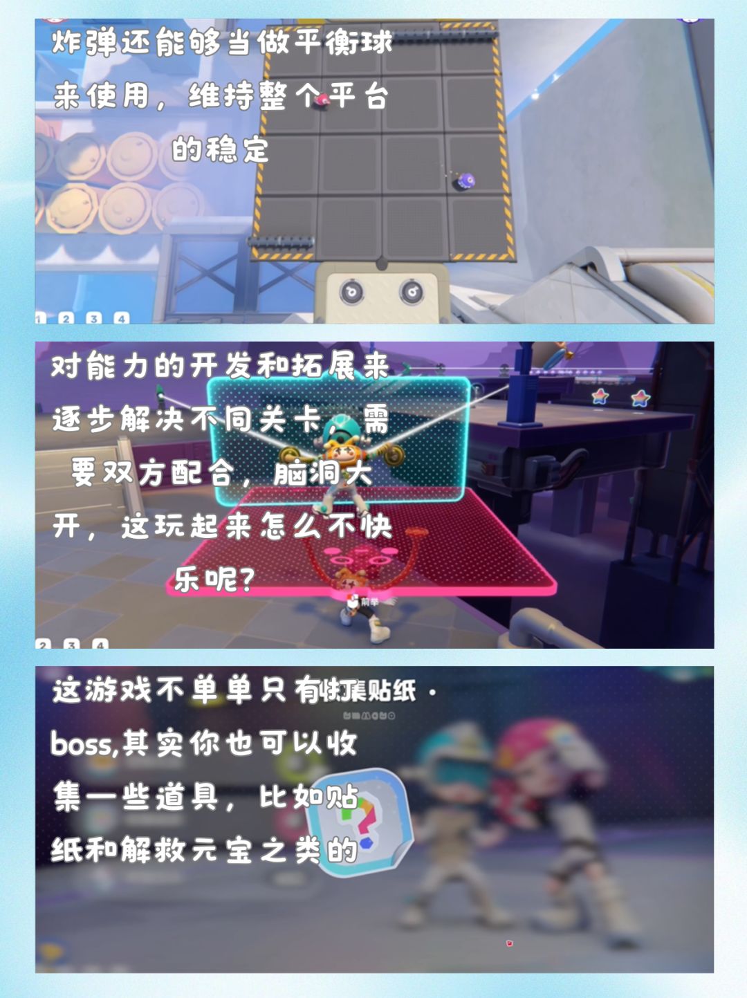 游戏还设有多种模式,故事模式双人合作,共有 24 关,前期教学关简单,正式关卡难度不等;派对模式支持 3 - 4 人合作,有 18 关,更考验玩家默契和配合。随着故事模式推进,还能解锁街机房小游戏,玩法围绕三消机制展开,超级上头🕹