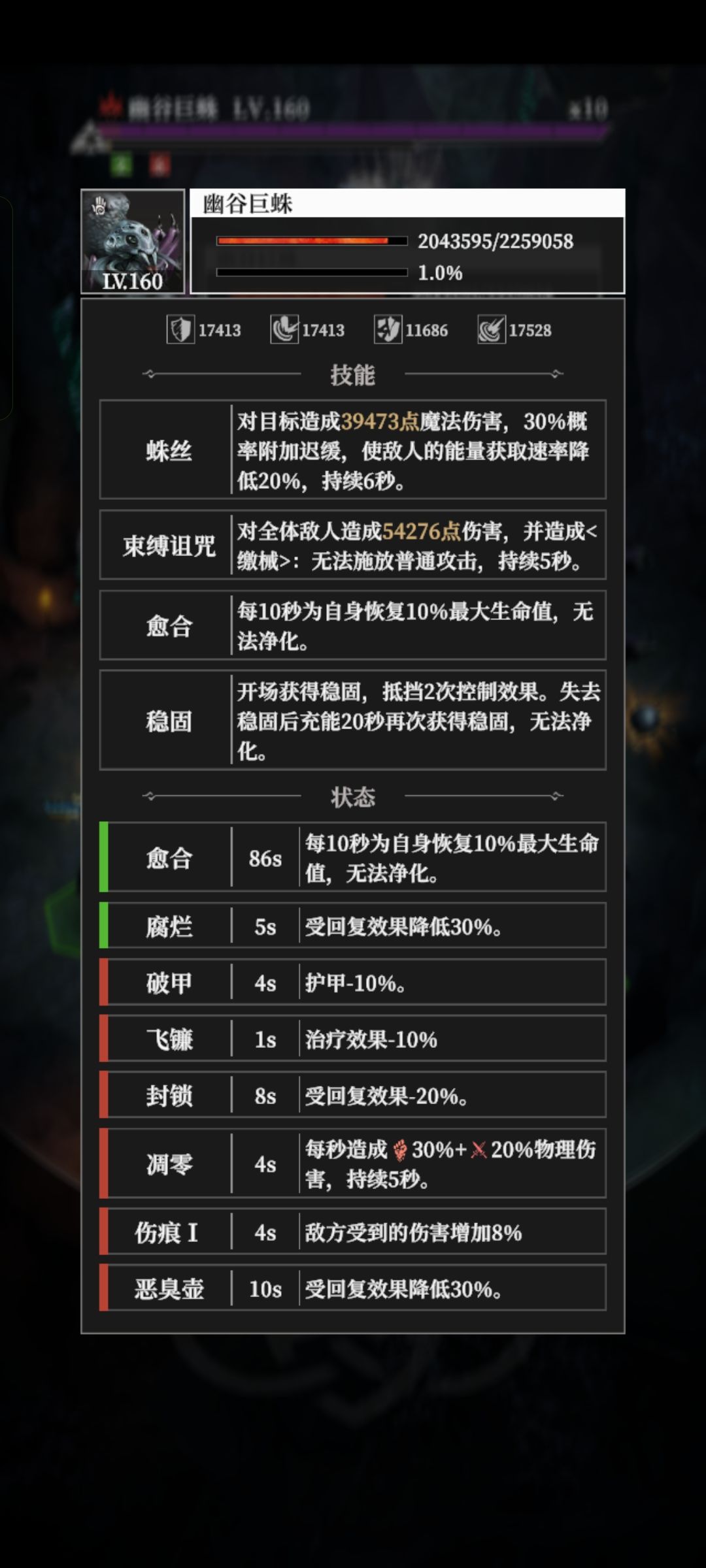 我上了一堆减疗装备,加了个恶臭壶测试了一下,虽然没用最高级恶臭壶,但是减疗90如果有用也能看出来了,但是应该减疗对这个boss没用,因为它回血一下回一格很容易看出来。