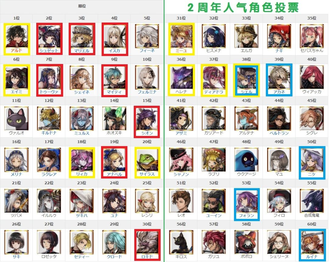 日版1~6周年人气角色投票结果,红黄蓝框含义同上。