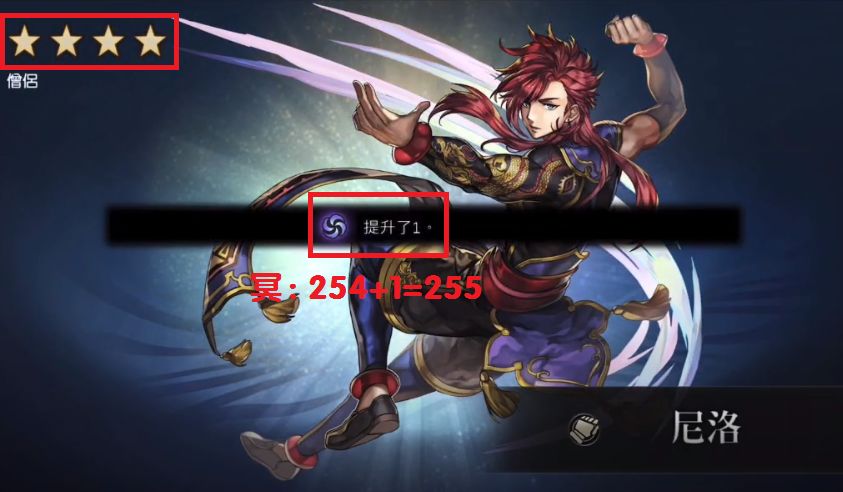 ①抽卡。抽到已有角色的5星NS/AS/ES,天冥值+16;抽到已有角色的4星NS,天冥值+4;抽到已有角色的3星NS,天冥值+1。如果抽到的角色天冥值已达255,则获得同等数量的天冥值提升道具。例如下图,抽卡前尼洛冥值已达254,又抽到4星尼洛,则其冥值+1,达到最大值255,并获得冥之诱惑(拳)×3,可用于提升其他拳角的冥值。