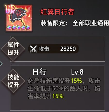红翼日行者:定位输出型UR装备,核心技能为“必杀技伤害提升15%;攻击生命值低于50%的敌人时,伤害率额外提升15%”。其特性聚焦于残血阶段的爆发增益,适用于以必杀技为主要输出手段的法师、爆发型战士。例如,法师角色在进入战场后,若目标已进入残血状态(如被控制技能或队友消耗后),红翼日行者的叠加增伤可使单次必杀技伤害提升至常规状态的1.3倍(15%基础增伤+15%残血增伤),显著缩短击杀时间。但该装备对目标血量有严格限制,若敌人血线稳定或战斗节奏偏慢(如持久战),其增益效果会大幅下降。