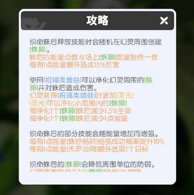 蛛后的核心技能机制是在场地中产生[蛛卵],[蛛卵]会持续给BOSS带来增益效果、给我方带来减益效果,给BOSS的增益效果包括额外造成伤害、控制技能概率提升、额外控制我方目标等,给我方的减益效果除了额外受伤以外自身的物防还会被降低。随着副本难度的提升,不清除掉[蛛卵]的话是完全没法打的,而清除[蛛卵]的唯一办法就是用圣堂阵营特有的[祝福类增益]来净化。